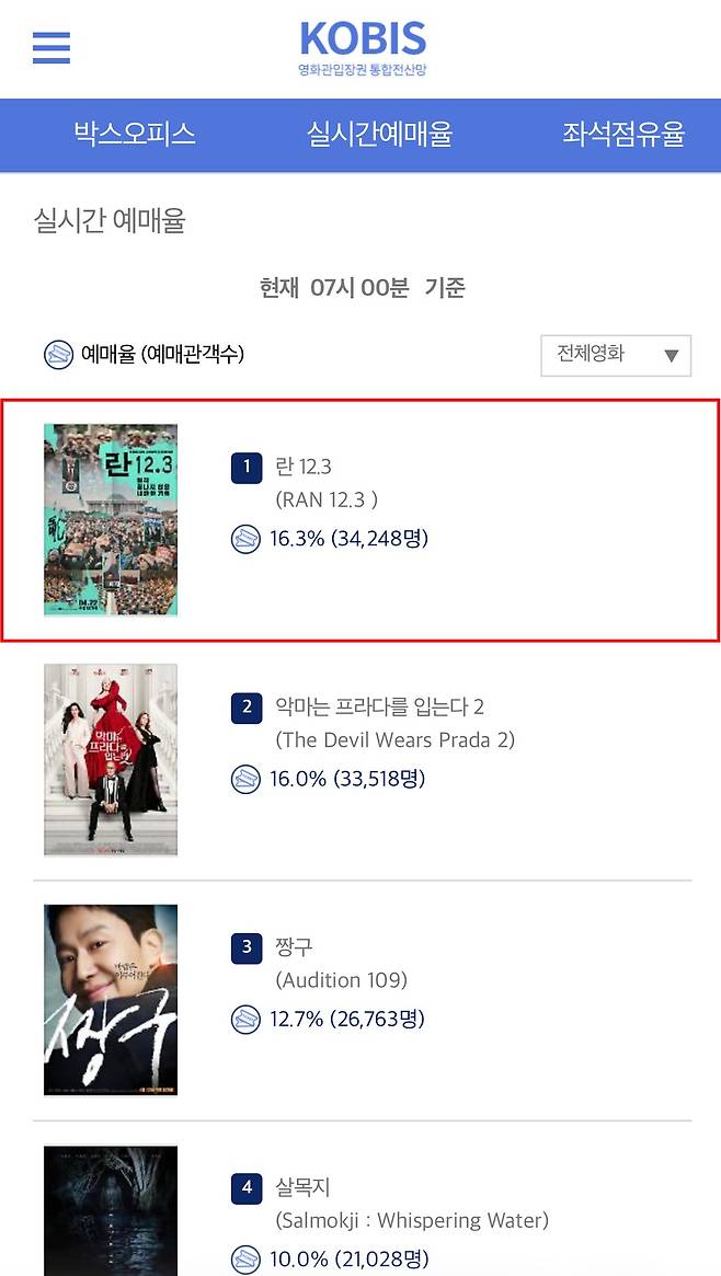 오늘(20일) 오전 7시 기준, '란 12.3'은 예매율 16.3%(34,248장)를 찍고 전체 예매율 1위에 등극했다.