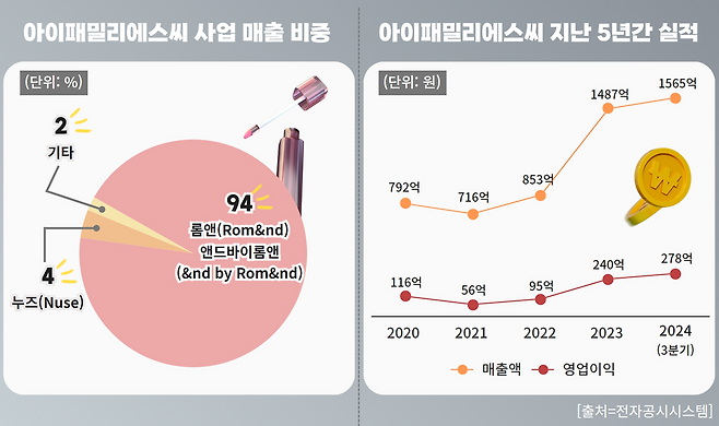 롬앤을 운영하는 아이패밀리에스씨는 2021년 코스닥 상장 이후 4년 연속 매출 성장을 기록하며 국내뿐 아니라 해외에서도 높은 인기를 끌고 있다. 특히 일본에서는 편의점 및 드럭스토어에 입점해 ‘일본 한정 컬러’까지 출시할 정도로 현지 반응이 뜨겁다.