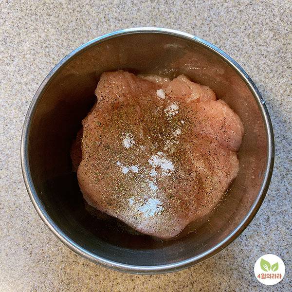 닭가슴살을 칼등으로 펴주고, 소금·후추·허브시즈닝으로 밑간 → 냉장 숙성 30분.