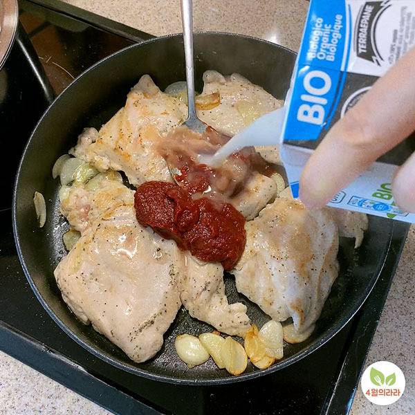 토마토소스 3T + 쌀음료 ½컵 + 설탕 1T + 블랙올리브 넣고 → 골고루 섞어 5분간 중불로 끓이기.