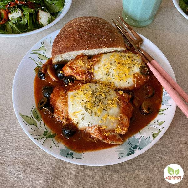 토마토소스에 폭폭 적셔 먹는 닭가슴살, 위에 부드럽게 녹은 생모짜렐라치즈, 거기에 갓 구운 빵과 샐러드까지 곁들이면… 밖에서 파는 브런치 못지않은 맛있는 집밥 완성!