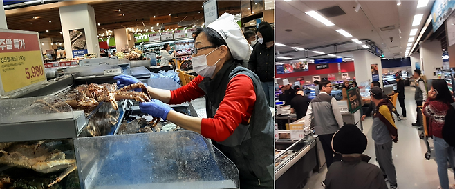 이에 대형마트들도 저렴한 가격을 앞세워 킹크랩 판매에 나서고 있습니다. 이마트는 지난 10월 20일, 21일 이틀 간 러시아산 레드 킹크랩을 100g당 5980원으로 판매했는데요. 올 9월 판매가의 반값에 달하는 가격에 10분 만에 완판행진을 이뤄냈습니다.