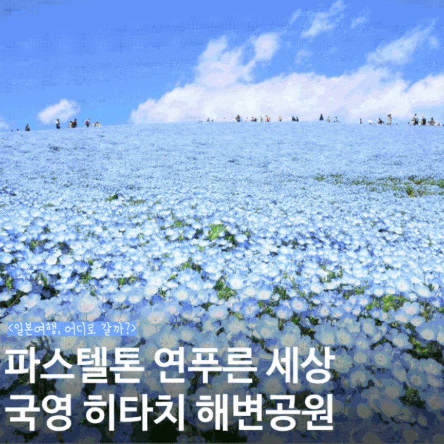 지금 가면 네모필라가 가득! : 히타치 해변 공원은 튤립, 코키아 등 1년 내내 다양한 꽃을 볼 수 있어요. 그중에서도 하이라이트는 4월 중순부터 5월 초까지 피는 네모필라인데요. 네모필라는 북아메리카가 원산지인 한해살이 풀이예요. 사진처럼 파란색이 아주 매력적인 꽃이죠. 네모필라는 이바라키의 파란 하늘과 태평양 바다와 잘 어울려 히타치 해변 공원에 심어졌는데요. 끝없이 펼쳐진 네모필라는 히타치 해변 공원의 봄을 대표하는 꽃이 되었어요.