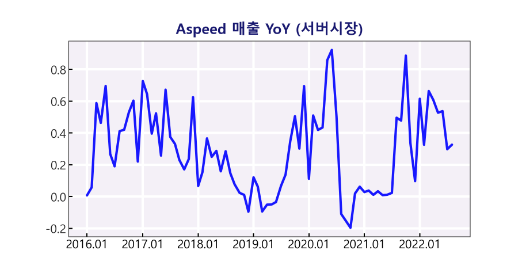 그리고 대만 IT 기업이자 반도체 팹리스 기업인 Aspeed(에이스피드)에서 생산하는 서버 모니터링 칩인 BMC(Baseboard Management Controller)는 서버 시장 점유을 70%를 차지하고 있습니다. 따라서 Aspeed 매출액 방향은 글로벌 서버 시장의 지표를 알려 줍니다.