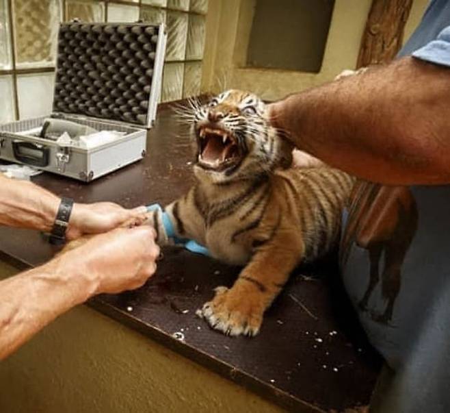 이렇게 무서운 표정을 하면 주사를 안 맞아도 된다고 생각한 모양입니다. 하지만 수의사는 이에 아랑곳하지 않고 아기 호랑이에게 주사를 놓았다고 하는데요.
