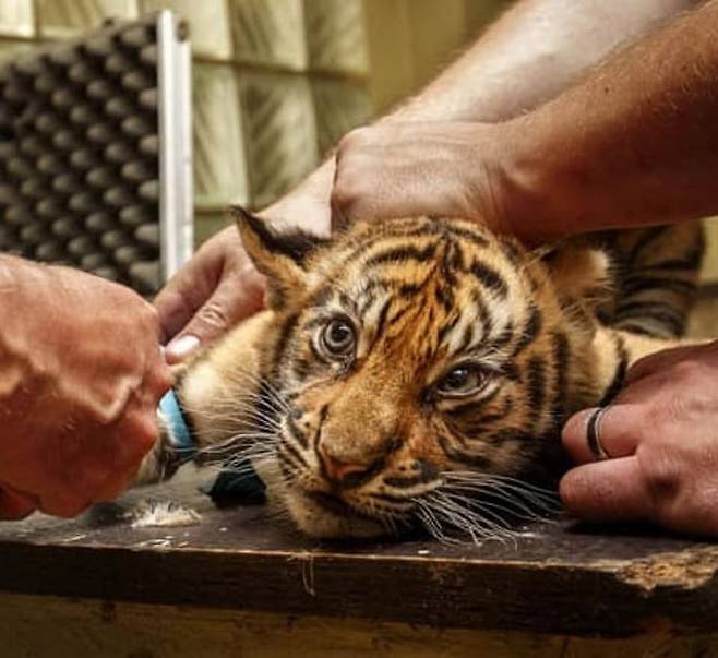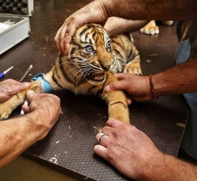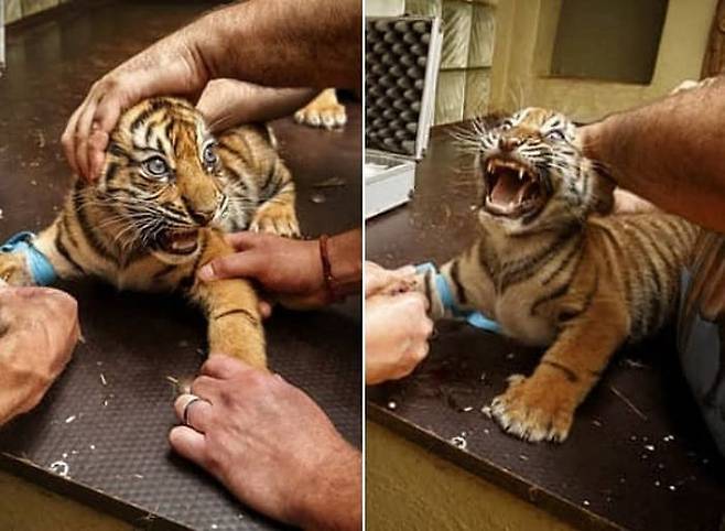 체코에 있는 자흘라바(Jihlava) 동물원에서 촬영된 것으로 알려진 사진 속에는 수의사 등 동물원 관계자가 아기 호랑이에게 예방접종 주사를 맞히려는 모습이 담겨 있었죠.