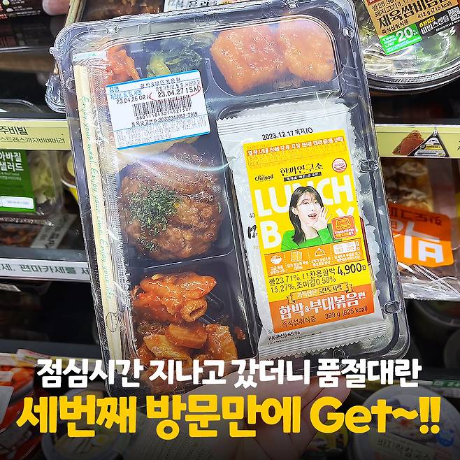 좋아하는 연예인이라 잘 나가서 너무 기뻤지만 당장 도시락을 구할 수 없었던 웃픈 현실! 포기하지 않고 주변 세븐일레븐을 연달아 방문한 끝에 세번째 만에 마지막 남은 1개를 겟할 수 있었어요!