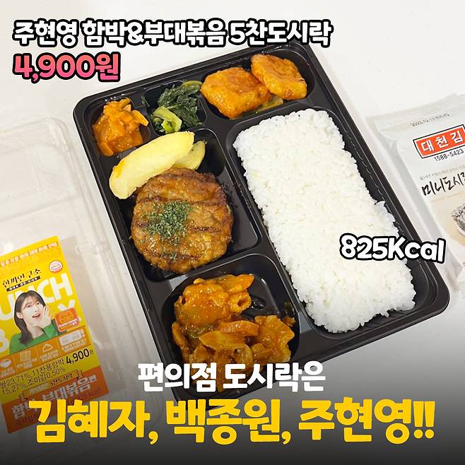 주현영 도시락 가격은 4,900원이에요! 편의점 도시락 치고 저렴한 편도, 그렇다고 비싼 편도 아닌 가격인 듯요! 칼로리는 825kcal인데 한끼 식사로 괜찮은 정도인 것 같아요.