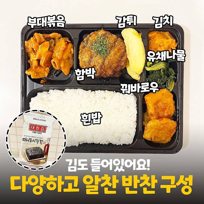 함박 스테이크와 부대볶음이 메인 반찬으로 들어있고 볶음김치, 유채나물, 꿔바로우가 곁들임 반찬으로 포함되어 있어요! 밥은 흰밥이고 김도 한봉지 포함되어 있답니다.