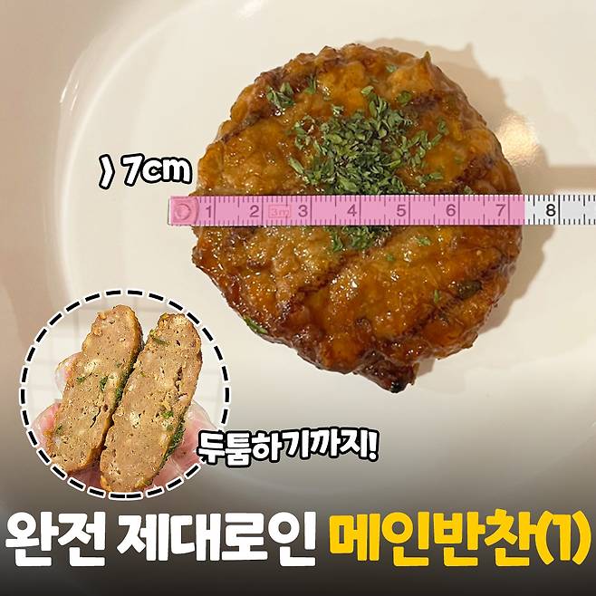 메인반찬 1번 주자인 함박 스테이크는 지름이 7cm가 조금 넘는 사이즈에요. 큰 사이즈는 아니지만 두께가 있어서 하나만 먹어도 배가 어느 정도 찰 것 같았어요. 함박 스테이크 사이사이에도 재료가 들어 있어서 씹을 때 육즙과 함께 풍부한 맛이 느껴졌어요!