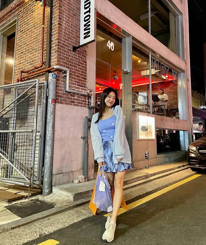 하선호는 파란색 니트 탑과 데님 스커트를 매치해 청량감 넘치는 스트릿룩을 선보였다. 여기에 오버사이즈 회색 가디건을 걸쳐 레이어드 스타일링의 정석을 보여주었으며, 컬러풀한 쇼핑백으로 포인트를 준 점이 돋보인다. 캐주얼하면서도 도시적인 감각이 느껴지는 룩이다.