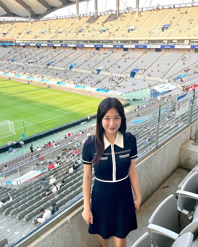 검은색 원피스에 화이트 칼라 디테일이 더해진 클래식한 디자인으로 우아함을 강조했다. 단정하면서도 세련된 이 룩은 경기장이라는 캐주얼한 공간에서도 고급스러운 분위기를 유지하며, 하선호의 패션 감각을 돋보이게 한다. 심플하지만 디테일에서 느껴지는 완성도가 인상적이다.