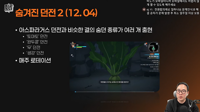 #. 생활 재료 채집 가능한 숨겨진 던전 이벤트 추가 - 12월 30일로 연기되어 공개 - 토마토, 완두콩, 무, 생강 던전이 매주 로테이션식으로 공개