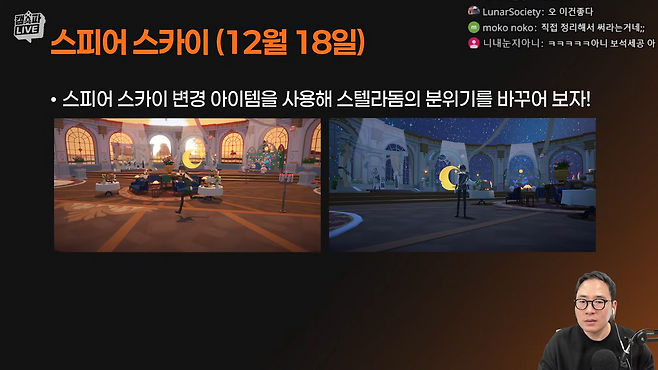 #. 악보책, 스피어 스카이, 포토부스, 마이홈 - 악보를 폴더별로 구분해서 보관하는 기능 추가 - 스텔라돔의 분위기를 바꿀 수 있는 기능 추가 ㄴ스피어 스카이 아이템을 사용하여 일정 시간 동안 변경 - 인생 네컷 컨셉트의 포토 부스 추가 - 마이홈은 이멘마하나 던바튼 등의 빈 집을 활용하는 컨셉 ㄴ자신의 서버 외의 다른 서버의 사람들도 초대 가능