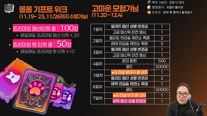 Q. 시즌 0에 비해 재화 소모량이 늘었는데, 상시 이벤트 보상 등은 그대로다 상향해달라 - 유저들의 성장 데이터 현황에 맞게 지속적으로 조정 중이다 - 패스 역시 구성을 조금씩 다르게 해서 업데이트 중이다 - 출석 보상은 검토하겠다