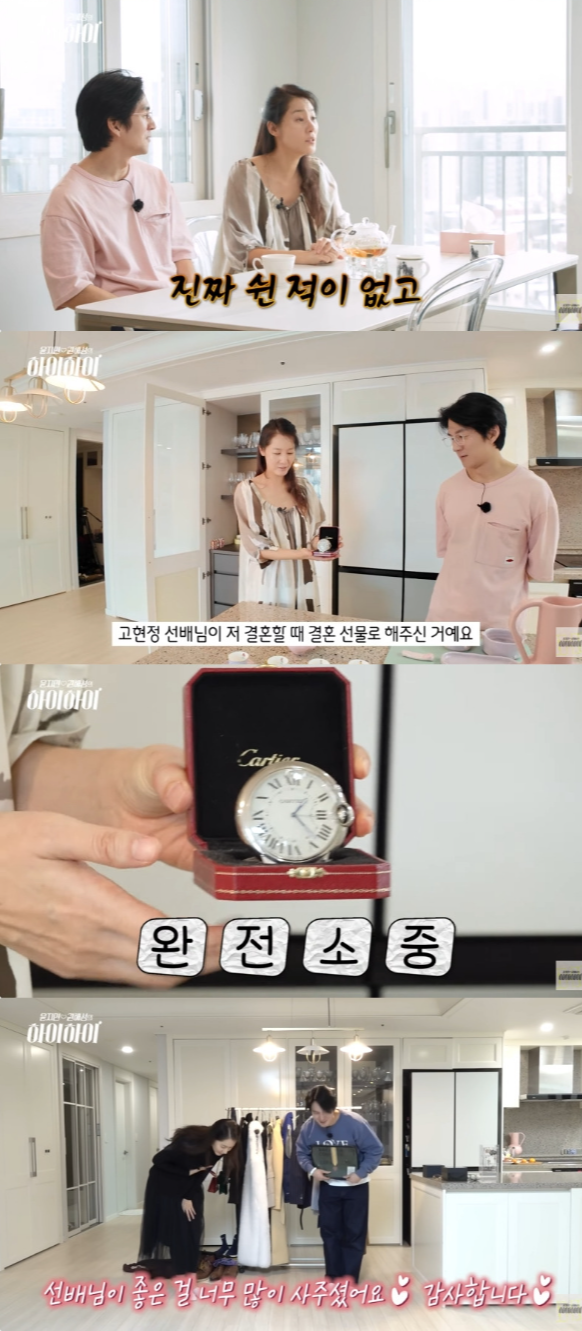 집안 내부를 소개하던 중 윤지민은 “이거 자랑할까”라고 운을 뗀 후 “고현정 선배님이 저 결혼할 때 선물로 해주셨다”며 명품 브랜드의 탁상시계를 꺼냈습니다. 부부는 “비닐도 안 뜯었다. 탁상시계에 ‘잘 살라’는 의미가 있다고 한다. 잘 간직하고 있다”고 소중하게 다뤘습니다.