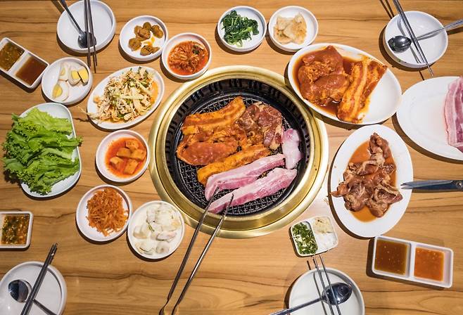 한국 음식은 한 끼에 여러 반찬을 함께 먹는 방식입니다.