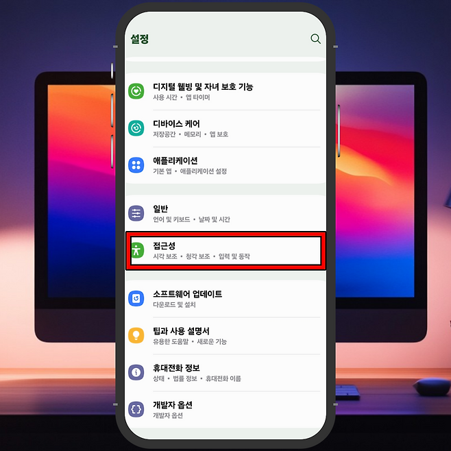 - 스크롤을 내려 '접근성' 항목을 찾고 클릭하세요.