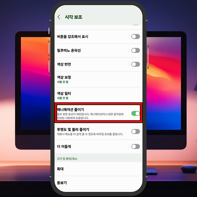 '애니메이션 줄이기' 기능을 활성화하면 즉시 속도를 높이고, 더 부드러운 사용 경험을 얻을 수 있습니다.