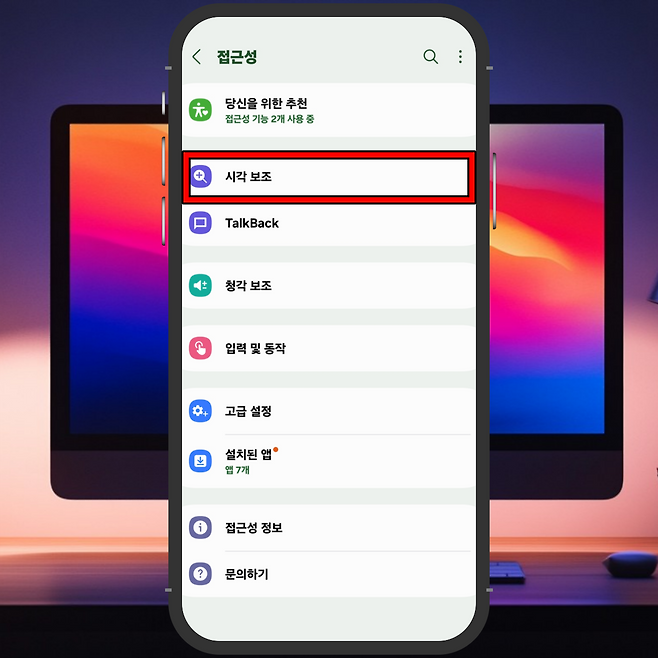 - 접근성 설정 내에서 '시각' 메뉴로 이동합니다.