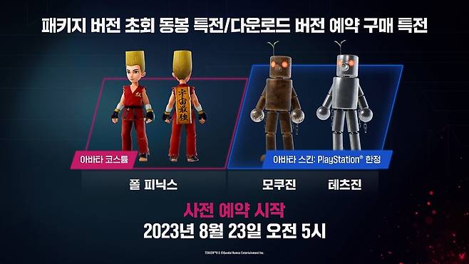 신규 트레일러 공개와 함께 다운로드 버전의 사전 예약도 시작됐습니다. 스탠다드 에디션, 디럭스 에디션, 얼티밋 에디션으로 나뉘며, 예약 구매 특전으로 아바타 코스튬 '폴 분장 세트'가 증정됩니다. 플레이스테이션5 플레이어에게는 추가로 모쿠진과 테츠진 아바타 스킨이 제공된다고 해요. 디럭스 에디션에는 스탠다드 에디션의 내용에 더해 출시 후 추가되는 4인의 캐릭터를 사용할 수 있는 플레이어블 캐릭터 Year 1 패스, 아바타 스킨 '킨진', 모든 캐릭터가 사용 가능한 코스튬 '금색 정장팩'이 주어지며, 얼티밋 에디션에는 디럭스 에디션에 아바타 코스튬 '클래식 철권 티셔츠 세트', 아바타 스킨 '미시마 카즈야', '카자마 진', '카자마 준'이 추가됩니다.