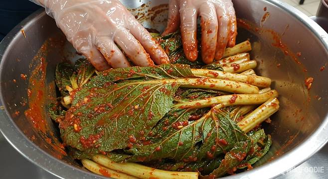 멸치액젓과 만난 갓은 감칠맛이 배가된다. 강한 채소일수록 조미료가 덜 들어가도 맛을 낸다. 양념에 사과주스를 더하면 갓의 강한 맛을 부드럽게 잡을 수 있다. 단맛과 매운맛, 감칠맛이 겹쳐지면서 밸런스가 잡힌다.