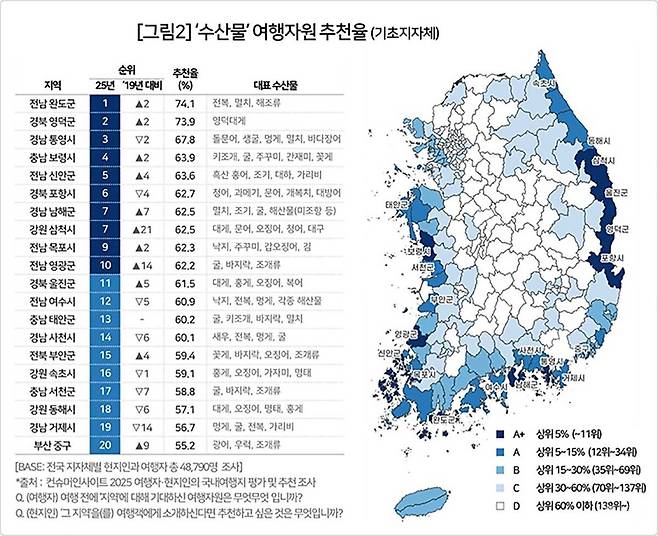 수산물 부문에서는 완도군이 전복과 김을 기반으로 한 74.1%의 추천율로 1위를, 경북 영덕군이 대게를 앞세워 73.9%로 2위를 기록했다. 통영시(67.8%), 보령시(63.9%), 신안군(63.6%)이 뒤를 이었으며, 삼척시는 ‘대게축제’ 재개 효과로 62.5%를 기록하며 21계단 상승했다. 광역지자체에서는 제주도가 39.0%로 1위를 차지했다.