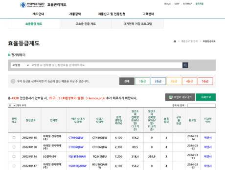 실제 측정한 냉방효율은 한국에너지공단 효율관리제도 홈페이지에서 모델명을 검색하여 확인할 수 있습니다.