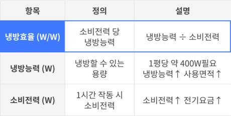 냉방효율은 에어컨의 냉방능력을 소비전력으로 나눈 값입니다.간단하게 냉방능력은 에어컨이 시원하게 할 수 있는 공간을 의미하고, 소비전력은 시원하게 할 때 소비되는 전력량을 의미합니다.