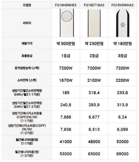 LG전자의 18평형 제품(냉방능력 7200W) 중 1, 2, 3등급을 선정했습니다.