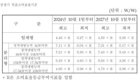 에너지 비용 절감을 위해 중장기 목표 소비 효율 기준도 고지하고 있습니다. 이 표에 따르면, 2024년 10월 1일부터 기존 냉방효율 7에서 오른 냉방효율 7.11 이상인 제품 부터 1등급을 획득할 수 있습니다.