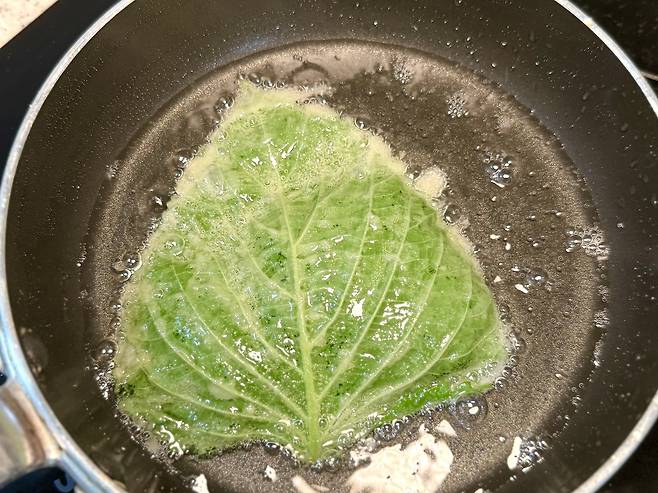 4. 여러 장 한 번에 올리시기보다 오래 걸리더라도, 1장씩 올리시는 걸 추천해요. 프라이팬에 올린 깻잎은 바로 뒤집지 마시고, 1분 30초 뒤에 뒤집어주세요.