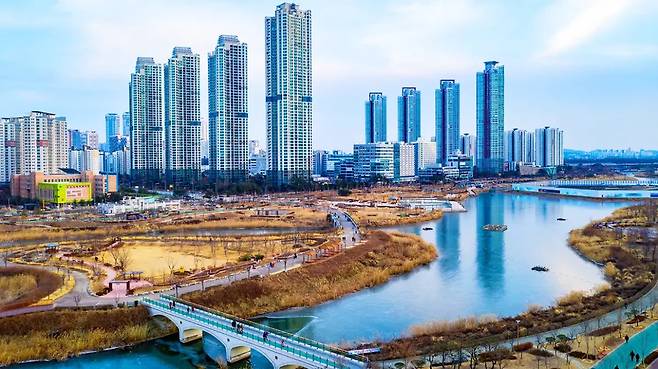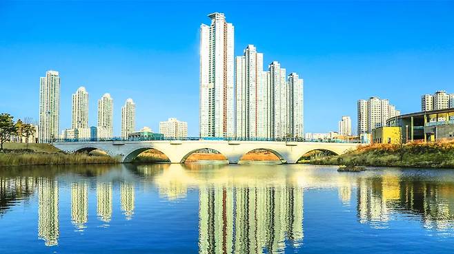 해 질 무렵, 청라국제도시의 마천루들이 호수면에 하나둘 불빛을 수놓기 시작합니다.