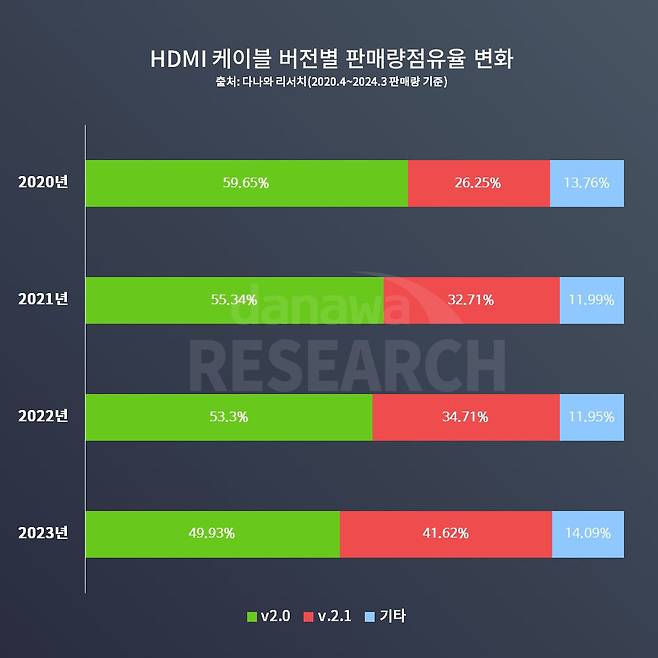 우선 HDMI 케이블의 버전을 알아야 한다. 알다시피 HDMI 케이블의 버전이 올라갈수록 전송 가능한 데이터의 대역폭이 넓어지기 때문에 구현 가능한 최대 해상도와 최대 FPS가 달라지게 된다. v2.0과 v2.1은 이론상 대역폭이 최대 3배나 차이 난다. 다나와 리서치의 판매량 점유율을 보면 v2.0까지 지원하는 HDMI 케이블은 2년 전인 2022년 무렵엔 59.65%로 가장 많았다. 그다음 버전인 v2.1을 지원하는 HDMI 케이블은 26.25%로 두 번째로 많은 판매량 점유율을 보였다. 하지만, 2년이 지난 현재엔 이야기가 살짝 달라졌다.