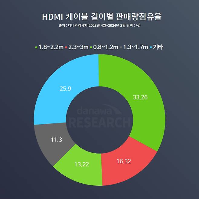 일반적인 160cm 책상보다 긴 180~200cm 책상이나 모니터 암으로 측면 길이가 더 길게 연장되는 환경에서는 3m짜리 케이블도 많이 쓰이는 것으로 해석할 수 있다. 하지만, 세 번째로 많은 점유율이 0.8~1.2m짜리 짧은 케이블이라는 것은 HDMI 케이블이 비단 PC뿐만 아니라 노트북과 서브 모니터를 연결하는 환경에서도 많이 사용된다는 점을 나타낸다.