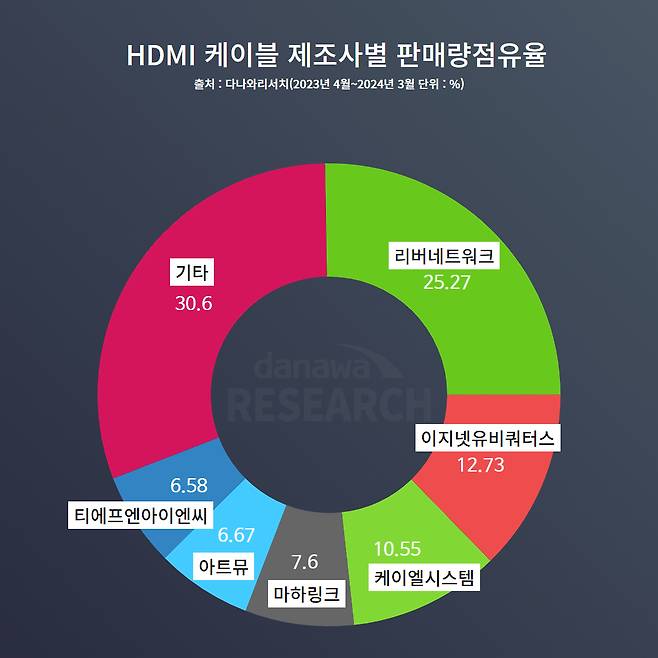 제조사별 판매량 점유율을 보면 리버네트워크가 25.27%로 1위며, 그 뒤로 이지넷유비쿼터스, 케이엘시스템, 마하링크 순이다. HDMI 케이블은 소모품 성격이 강한 제품군이라 제조사를 따지지 않고 가격과 상품평으로 승부를 보는 게 대부분이다. 하여 벨킨이나 까나레같은 고급형 외산 브랜드들은 10위권 밖에 분포되는 모습을 보이고 오히려 국내 중소 유통사의 제품이 각광을 받고 있다. 이런 국내 중소 유통사의 제품도 고급형이 많이 나오고 경쟁력도 점점 올라갔기 때문에 무조건 글로벌 대기업의 제품을 선호하는 것은 옳지 않다고 본다.