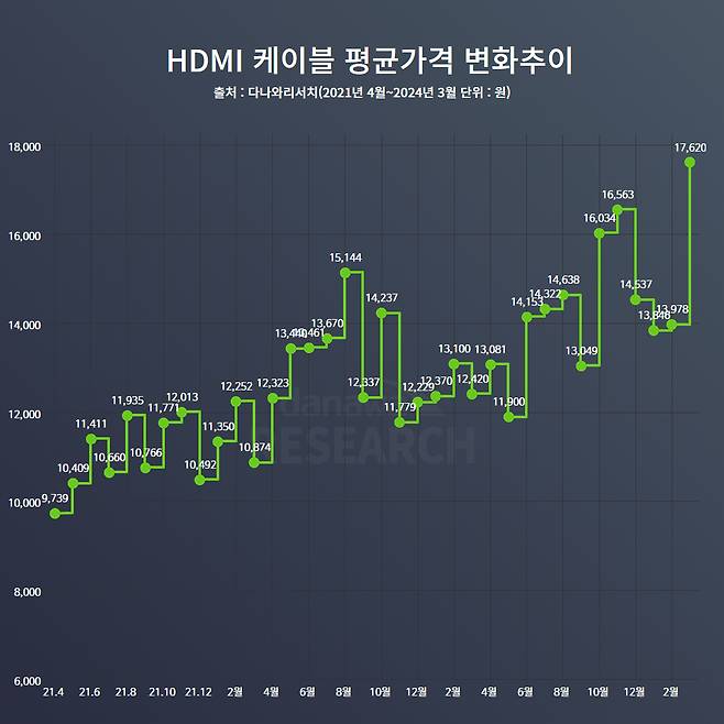 하지만, 살짝 아쉬운 사실은 HDMI 케이블의 평균 가격도 점점 올라가고 있다는 것이다. 2021년 4월까지만 해도 9,739원 하던 평균 가격이 현재 들어 17,620원까지 올라간 상황이다. 배율로 따지면 무려 1.8배나 오른 것. 이는 HDMI 케이블 피복의 주원료인 석유 가격에 민감하게 반응하는 것으로 해석된다. 두바이유 기준으로 원유값이 내려간 시즌에는 HDMI 케이블의 평균 가격은 하향곡선을 그리다가 반대 상황이 왔을 땐 급상승하는 추이를 보인다. 더불어 케이블 피복의 내구성을 높이기 위해 패브릭이나 PVC 나일론 등의 실드 처리, 커넥터 부분의 금도금 처리를 한 고급형 케이블이 늘어난 것도 평균 가격의 상승에 영향을 준 것으로 보인다.