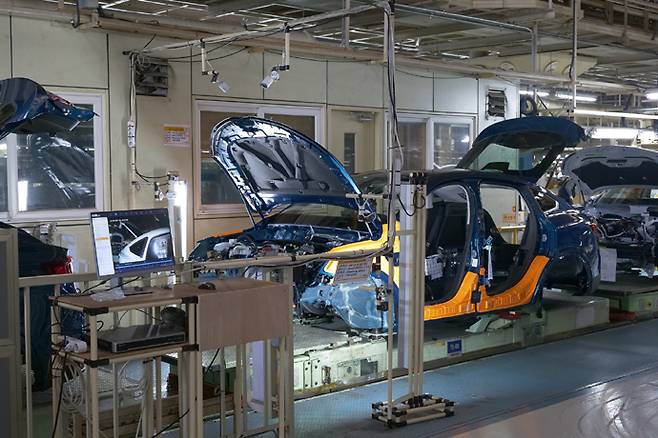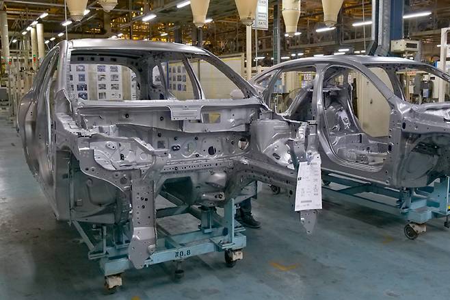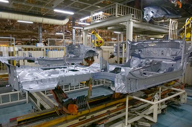 그렇게 만들어진 패널은 다음 단계인 차체 공장으로 넘어가 골격으로 만들어 진다. 이 공정은 대부분 로봇이 한다. 현재 차체 조립에는 618대의 로봇이 배치되어 있다. 차체와 도장 공정의 경우 100% 자동화되어 작업이 이뤄진다. 프레스공정과 마찬가지로 자동화에 의해 품질의 일관성을 이루는데 중요한 역할을 한다.
