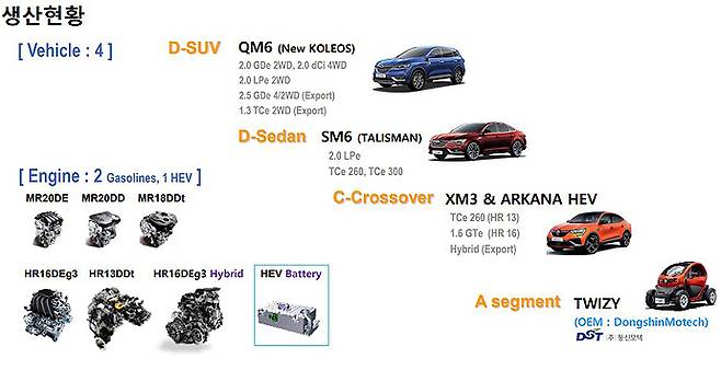 르노코리아 부산 공장에서는 현재 QM6와 SM6, XM3와 XM3의 수출형 모델인 아르카나, 그리고 동신모텍의 OEM으로 생산되는 트위지가 생산되고 있다. 차량 뿐만 아니라 엔진의 경우 2개의 가솔린 엔진과 1개의 하이브리드용 엔진, 그리고 하이브리드용 배터리가 생산되고 있다.