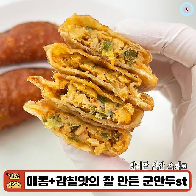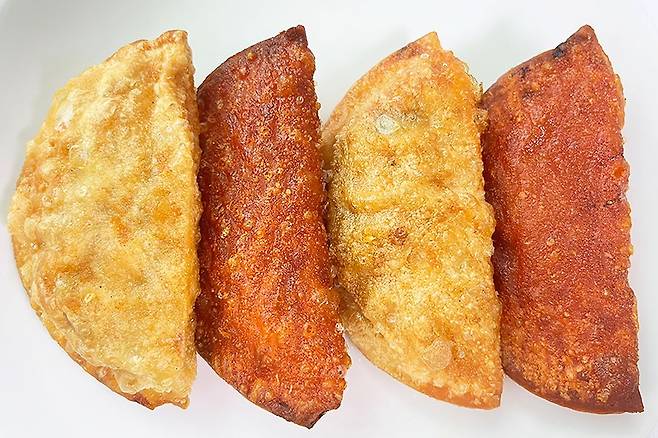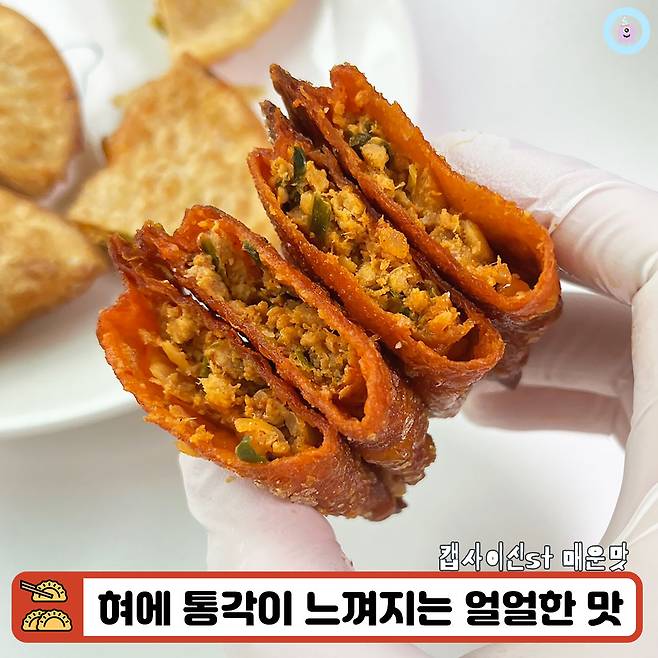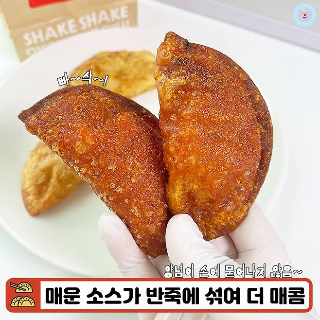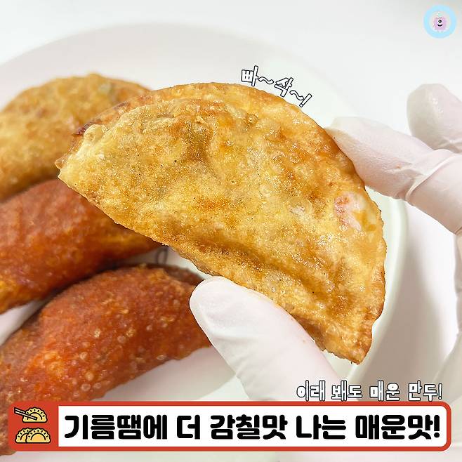 칼로리는 169Kcal 정도이고 한 눈에 보기에도 바삭할 것 같은 만두피가 매력적이었어요. 특히 빨간맛과 보통맛(?) 모두 겉에 양념이 없는 편이라 깔끔하게 먹을 수 있을 것 같아 첫인상도 좋았답니다.