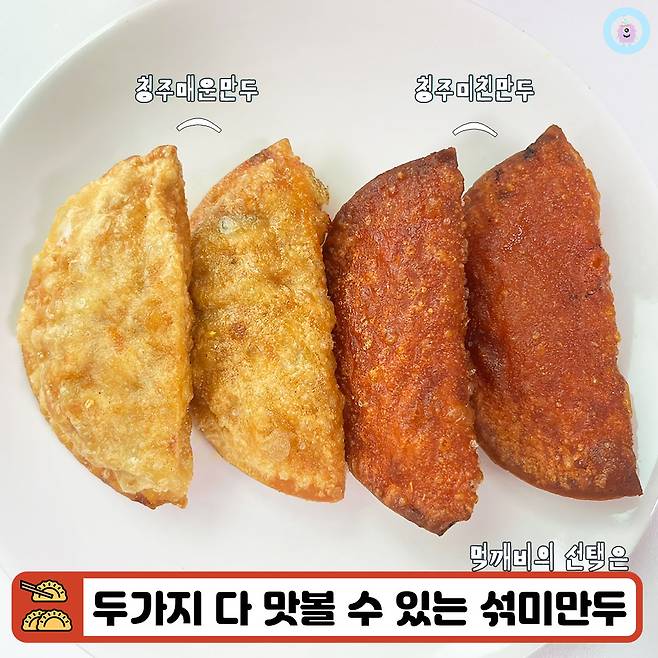 청주만두는 <매운만두>와 <미친만두> 두 가지 맛으로 출시되었어요. 맵기는 각각 6단계와 8단계라고 해요! 매운만두나 미친만두만 구매할 수도 있지만 먹깨비의 선택은 두 가지 모두 맛볼 수 있는 <섞미만두>~!!