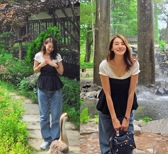 전통 한옥 정원과 푸르른 풍경이 어우러진 배경 속, 유인영은 사랑스러운 미소와 함께 따뜻한 분위기를 더하며 팬들의 시선을 사로잡았다.