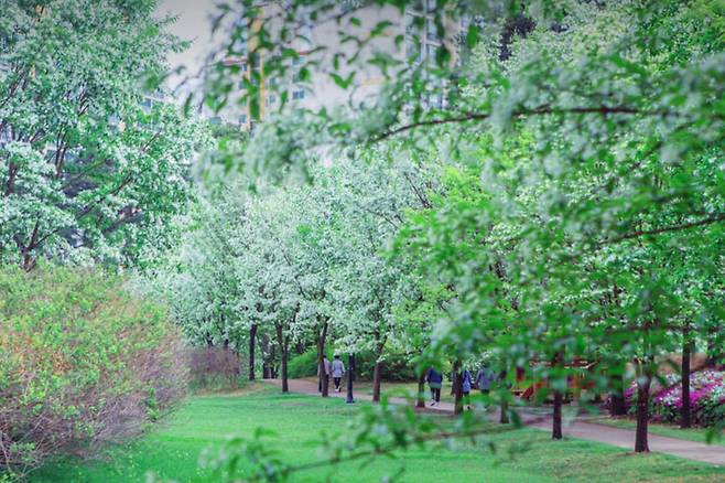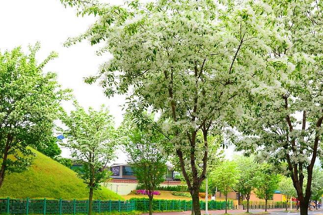 평소에는 조용한 공원이지만, 5월이 되면 이팝나무들이 줄지어 피어나며 새하얀 꽃 터널을 만들어 냅니다.