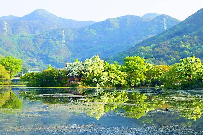 저수지 중심에 자리한 완재정(翫齋亭)은 고즈넉한 기와지붕 아래 반영을 이룬 채 물 위에 떠 있으며, 이팝나무의 하얀 꽃송이와 함께 그림 같은 조화를 이루죠.