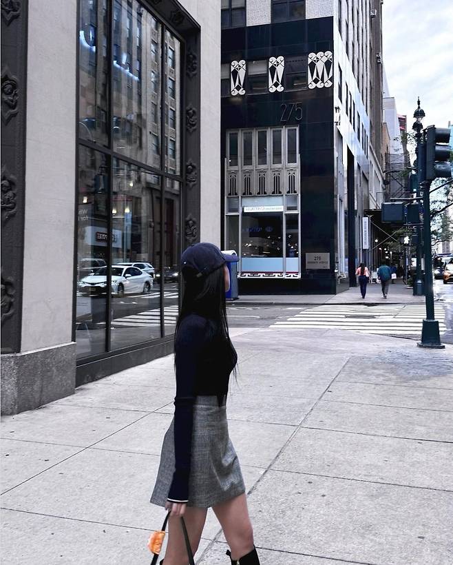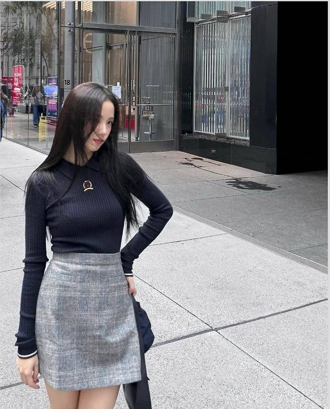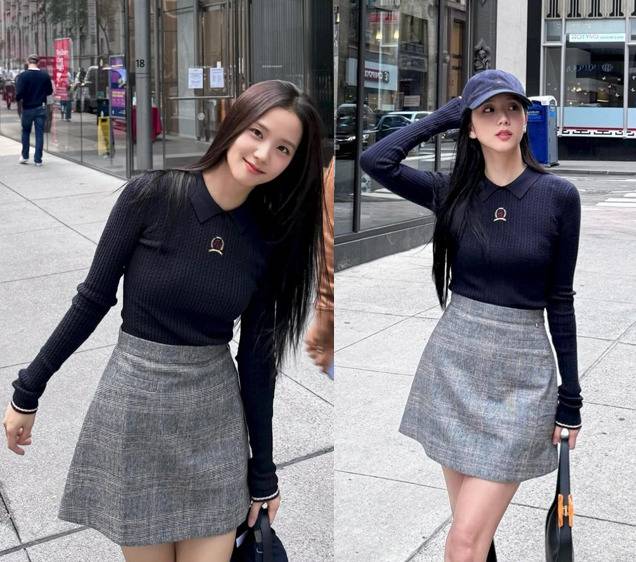 또 지수는 그레이 체크 미니스커트를 매치해 세련된 도시적인 느낌을 강조했습니다.