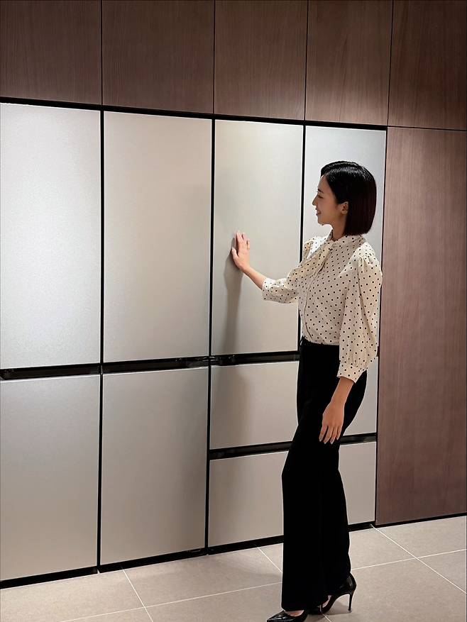 여기에 도트 패턴의 블라우스와 슬림한 블랙 팬츠를 매치해 아나운서 출신다운 깔끔한 포멀룩을 보여줬어요.