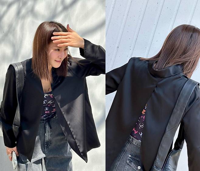 이시영은 세련된 그래픽 프린트 블랙 톱에 뒤트임 포인트를 더한 독특한 디자인의 블랙 실크 셔츠를 착용해 매력적이고 고급스러운 패션을 선보였습니다.