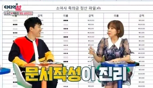 이어 축의금 1등이 누구냐는 질문에는 유재석을 꼽았다. 액수는 촬영 현장에서만 공개됐는데, 많은 이들이 깜짝 놀랄 수준의 금액이라고 해 유재석을 치켜세웠다.