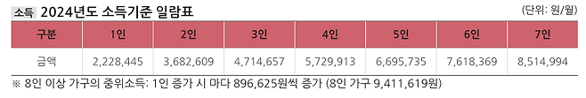신청 기준에 해당한다면 이제 선정 기준이 맞는지 확인해야 합니다. 선정 기준도 소득과 재산 기준 모두 충족되어야 합니다. 신청인과 가구원의 소득 합계가 2024년 소득기준 일람표를 기준하여 중위소득 100% 이하여야 합니다. 만일 가족 구성원이 8인 이상이라면 가족 1인 증가할 때마다 896,625원씩 소득기준 금액도 증가하여 계산해야 합니다. 또한, 신청인과 가구원의 재산 합계가 3억 5천만 원 이하여야 합니다. 이때 주택, 건물, 토지 임대차보증금 등을 합산해서 계산해야 합니다.