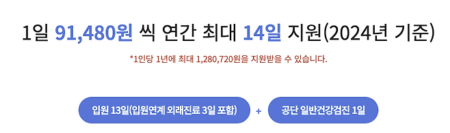 지원 금액이 2023년 89,250원에서 2024년부터는 91,480원으로 확대해 연간 최대 128만 원까지 지원하도록 조례를 개정하였습니다. 지원일수는 연 최대 14일 지원되며, 이는 입원 13일(입원 연계 외래진료 3일 포함) 및 공단 일반 건강검진 1일을 포함합니다.